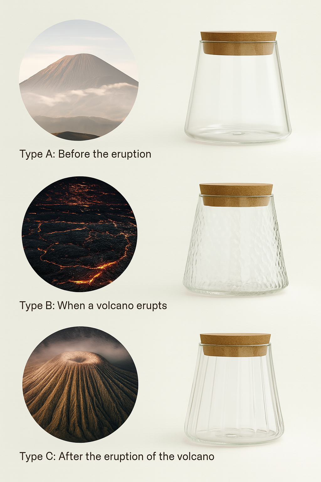 Each version reflects the natural topography of a volcano at a different stage, making this piece not just a vase, but a conversation starter.